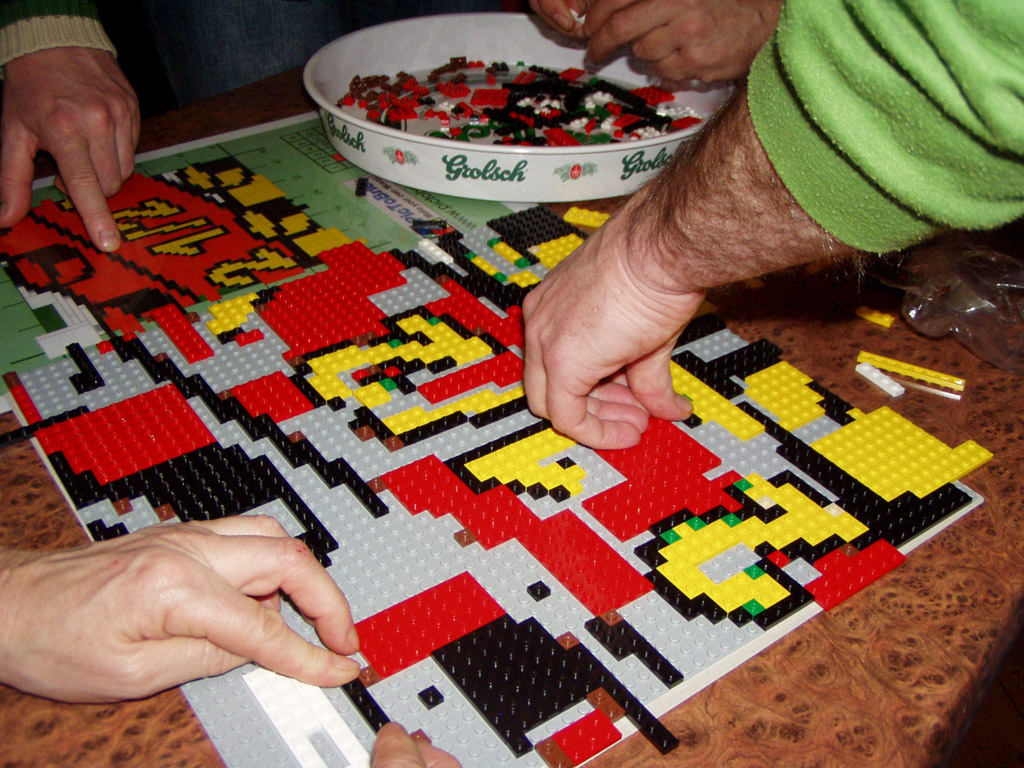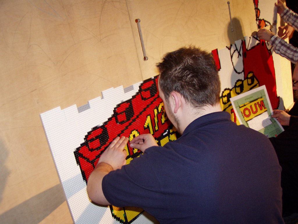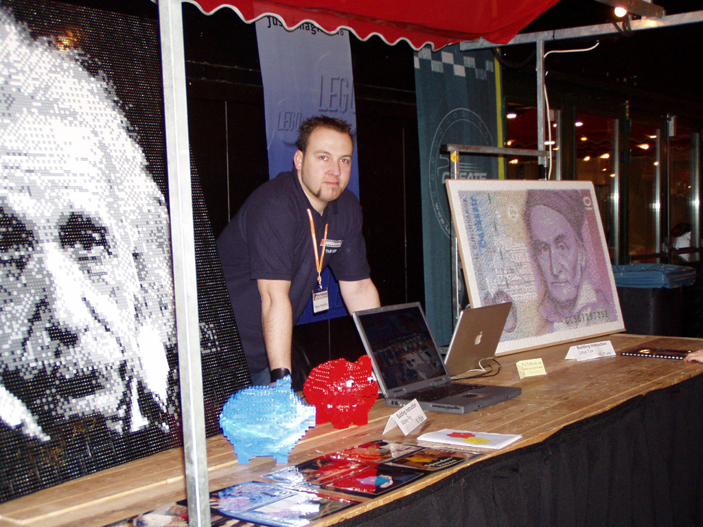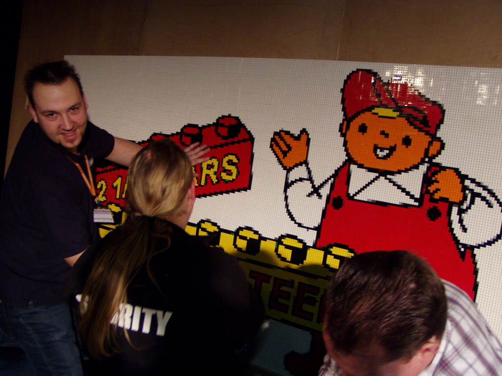 Shortly after finishing our diploma thesis (PicToBrick), Jan Beyer (Lego Community Manager) invited us to the 12 1/2 year anniversary of the Dutch Lego club De Bouwsteen. He wanted to bring the material for a very large mosaic of the club logo as a gift. Adrian and me were asked to create the building instructions for this mosaic, which was to be built during the evening of the festival by many small groups. The following photos show the building of the mosaic, the exhibition, and the festival evening.